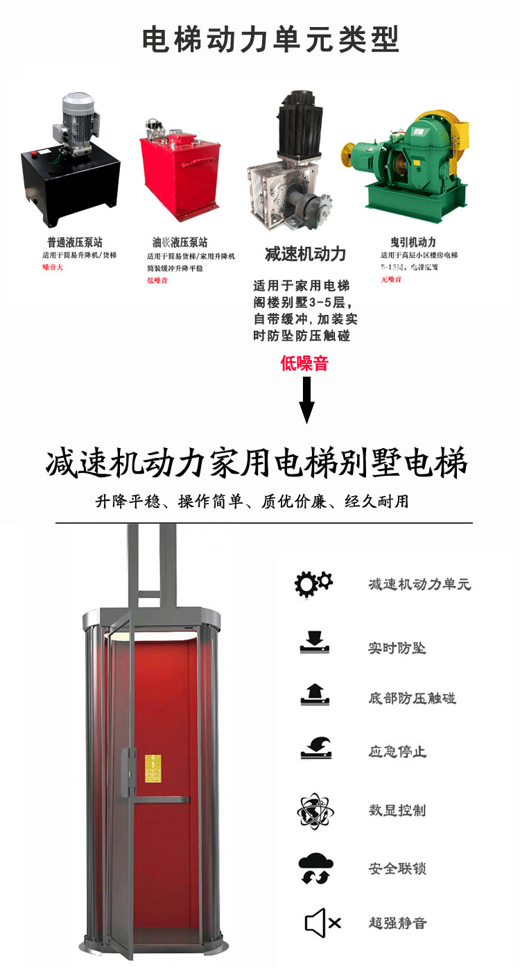 手拉门(及手动门)的结构类似于我们家里常用的门,有门锁联动装置和比较重。有安全装置系统:有停电应急、电磁锁、减震器、变频器、漏电保护器等多处为了人们使用家用电梯安全设置。升降平稳、操作简单、优质价廉、载人载杂物均可。为人们提供了方便,节省了时间,为工作提供了效率。